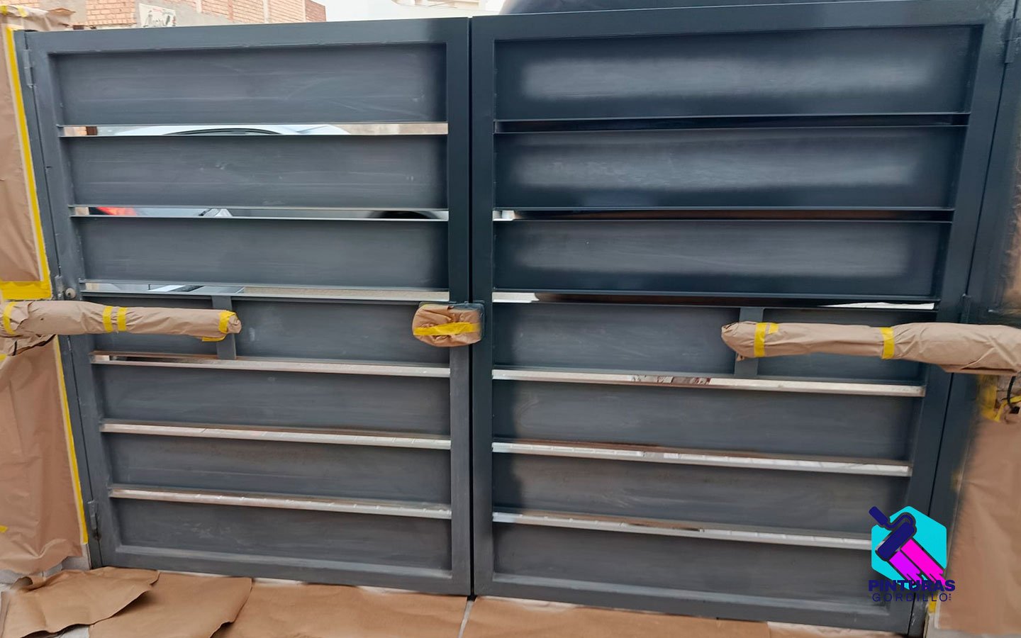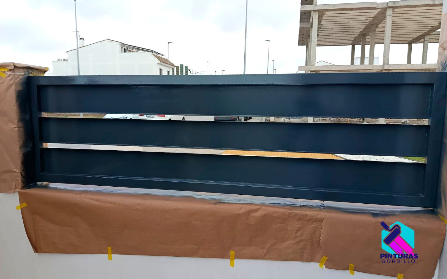 En los herrajes metálicos, realizamos lijado previo, aplicación de imprimación antioxidante (minio) y acabado final en gris antracita, asegurando protección frente a la corrosión y un acabado moderno y elegante.